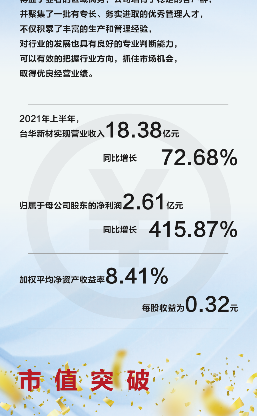 2021年上半年,k8凱發官網實現營業收入18.38億元,同比增長72.68%。歸屬于母公司股東的凈利潤2.61億元,同比增長415.87%,加權平均凈資產收益率8.41%,每股收益為0.32元。市值突破100億元!